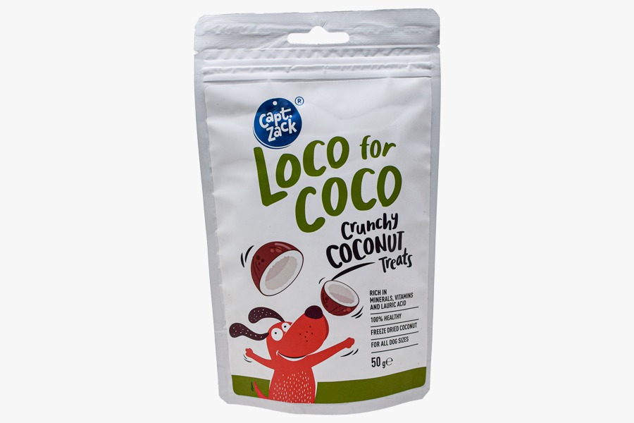 Capt Zack Loco for Coco Crunchy Coconut Treats are crunchy and delicious coconut treats provide a handy go-to snack for any big-boned dog seeking to lose a little weight. Being high in lauric acid means coconut helps bolster a dog’s healthy metabolism, which helps assist in weight loss. Lauric acid also has a hard-earned reputation for fighting off viruses, yeast infections and ringworm while reducing inflammation, helping aching bones and joints heal a bit quicker. You’d be nuts for not trying it out. An unflinching commitment to great taste and nutritional integrity means we freeze dry our coconuts because heavy-handed heat treatments suppress its natural flavours and nutritional worth. Freeze dried treats retain the same nutrition value as fresh fruits while transforming them into light, flavourful, crispy and delicious fruit treats.