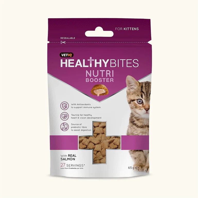 A delicious, daily snack that supports the overall health and development of a healthy immune system, our VetIQ Healthy Bites Nutri Booster Kitten Treats are made with real salmon and other healthy, natural ingredients.